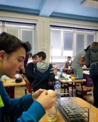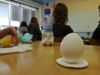V pátek 16.3.2018 se studenti této třídy zabývali reakcemi a ději, které se týkají bílkovin. Biologickým materiálem pro ně bylo vajíčko a mléko. Z vajíčka izolovali bílek a s roztokem bílku poté pracovali a zkoušeli, jak se tento roztok chová po přídavku kohoutkové vody, vařící vody, soli a různých chemických látek. U mléka si pak vyzkoušeli, jak se z něj sráží bílkovina kasein a jakým způsobem se vyrábí tvaroh a co je to syrovátka. To, jak jim šla práce od ruky, můžete usoudit z následujících fotografií.