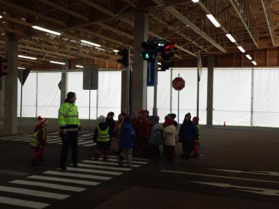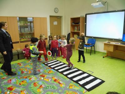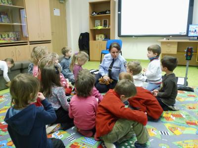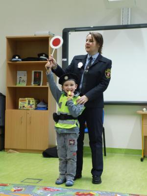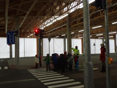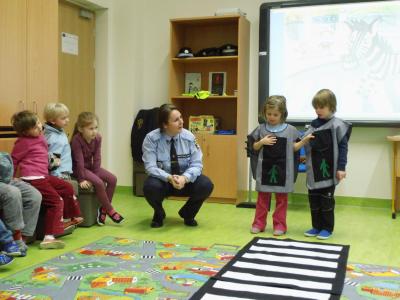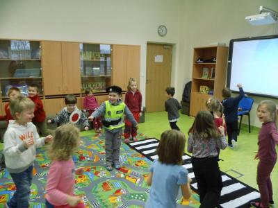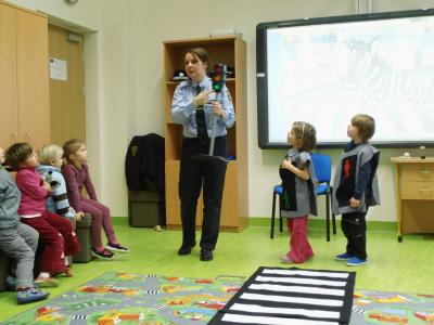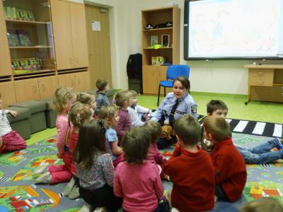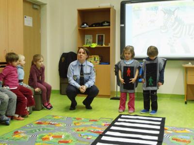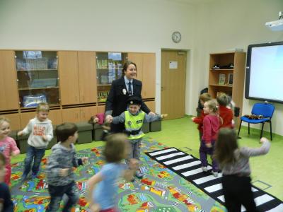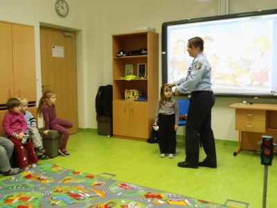 Navštívili jsme dopravní hřiště na Riviéře. Paní policistka nám povídala pohádku O neposlušném Koblížkovi, který se zatoulal na silnici. Ukázali jsme si, jak se pohybujeme po silnici, chodníku a po přechodu. Proč jezdíme na kole s helmou a proč bychom měli mít na oblečení reflexní prvky. Co máme dělat, když řídí dopravu policie a také jsme si to vyzkoušeli.