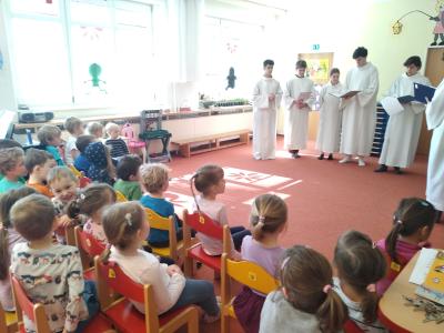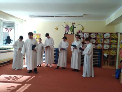Osm studentů ze SxA v pondělí 11. dubna V 10:00 zazpívalo Broučkům a Beruškám z MŠ VELIKONOČNÍ PAŠIJE.